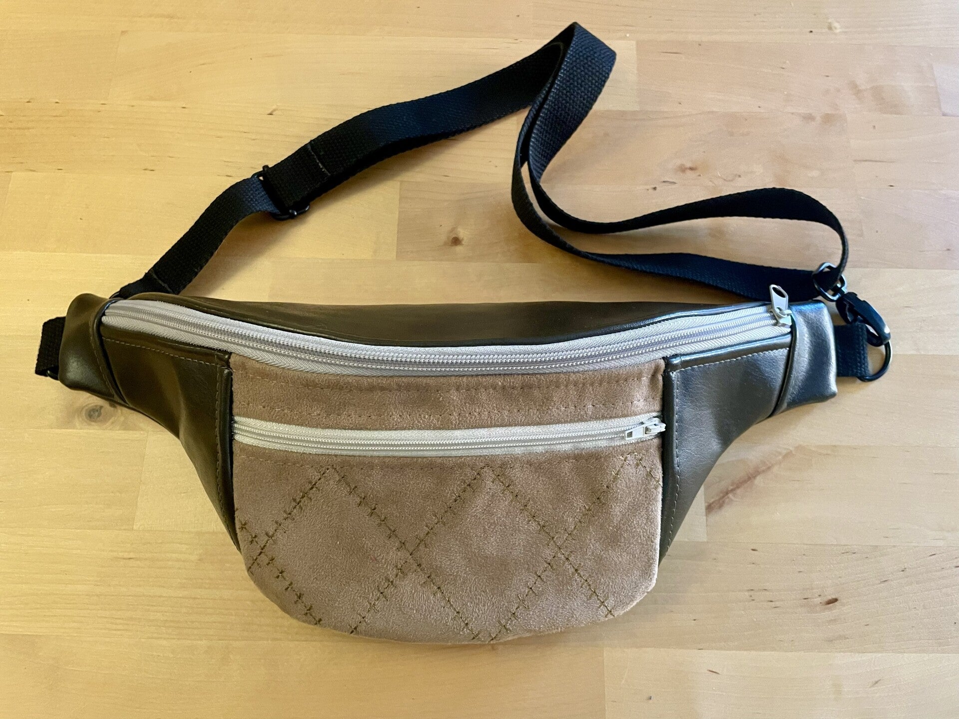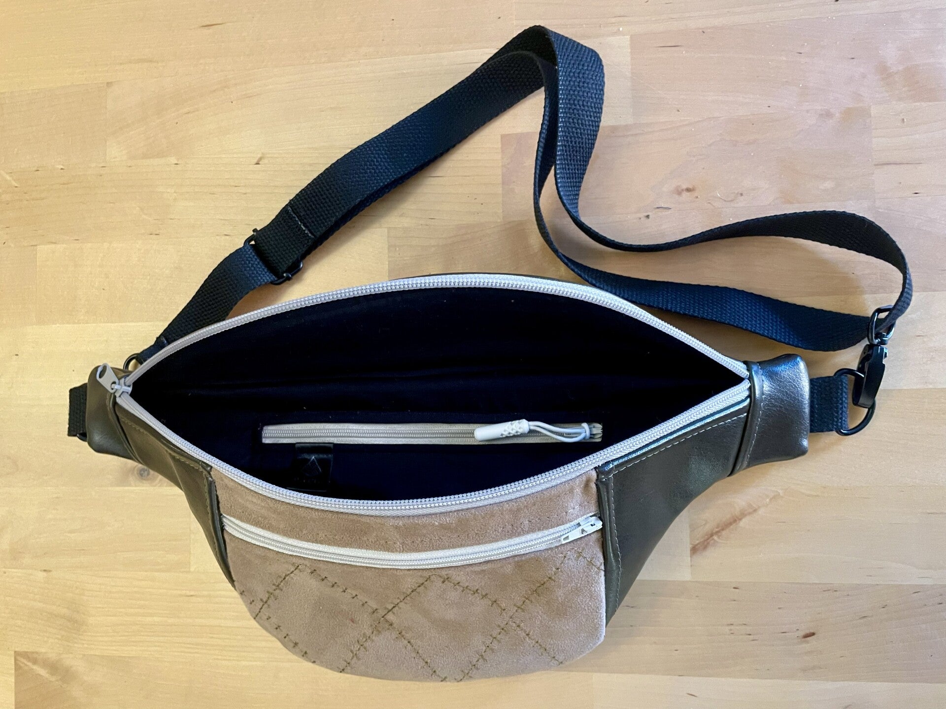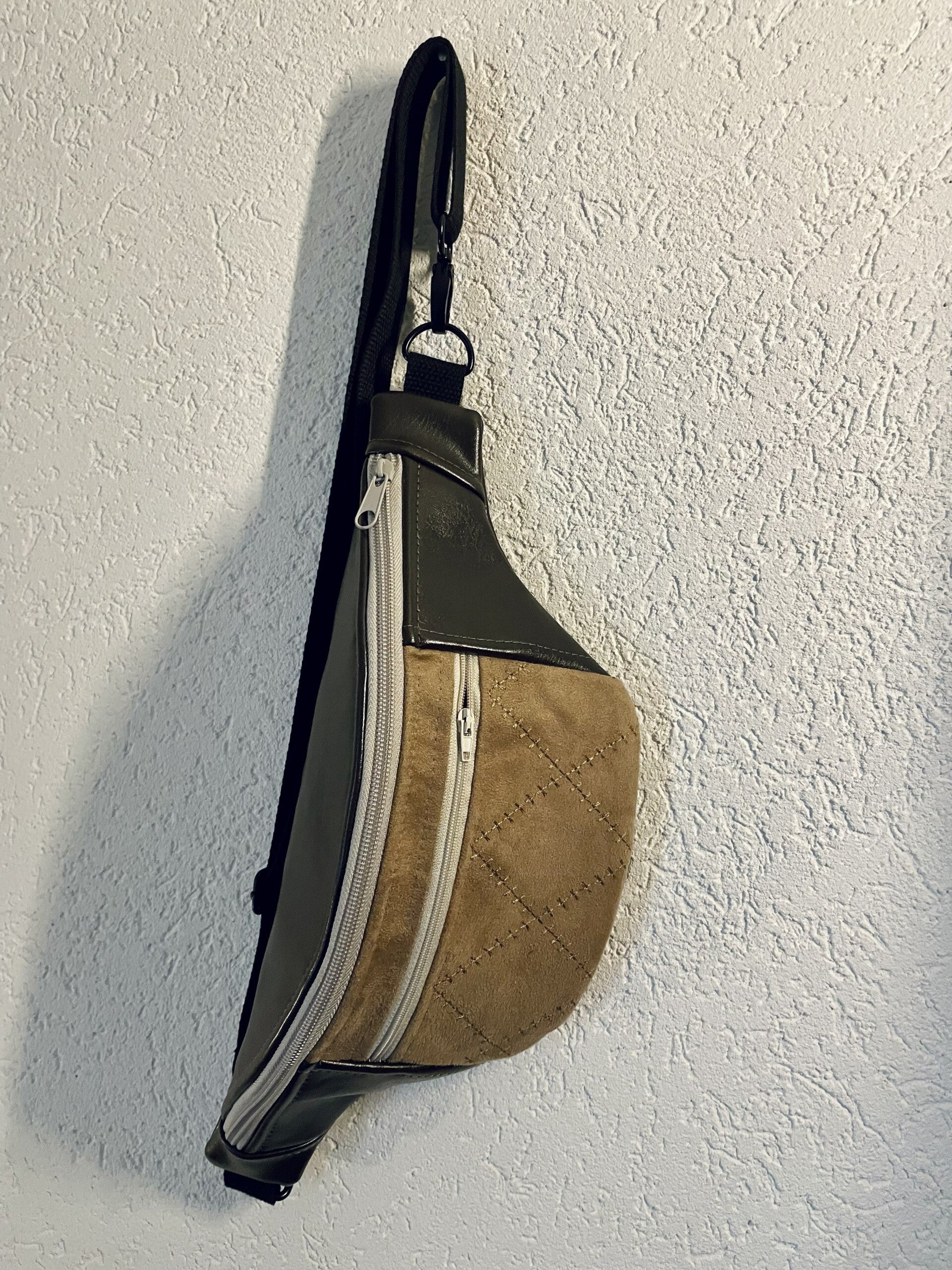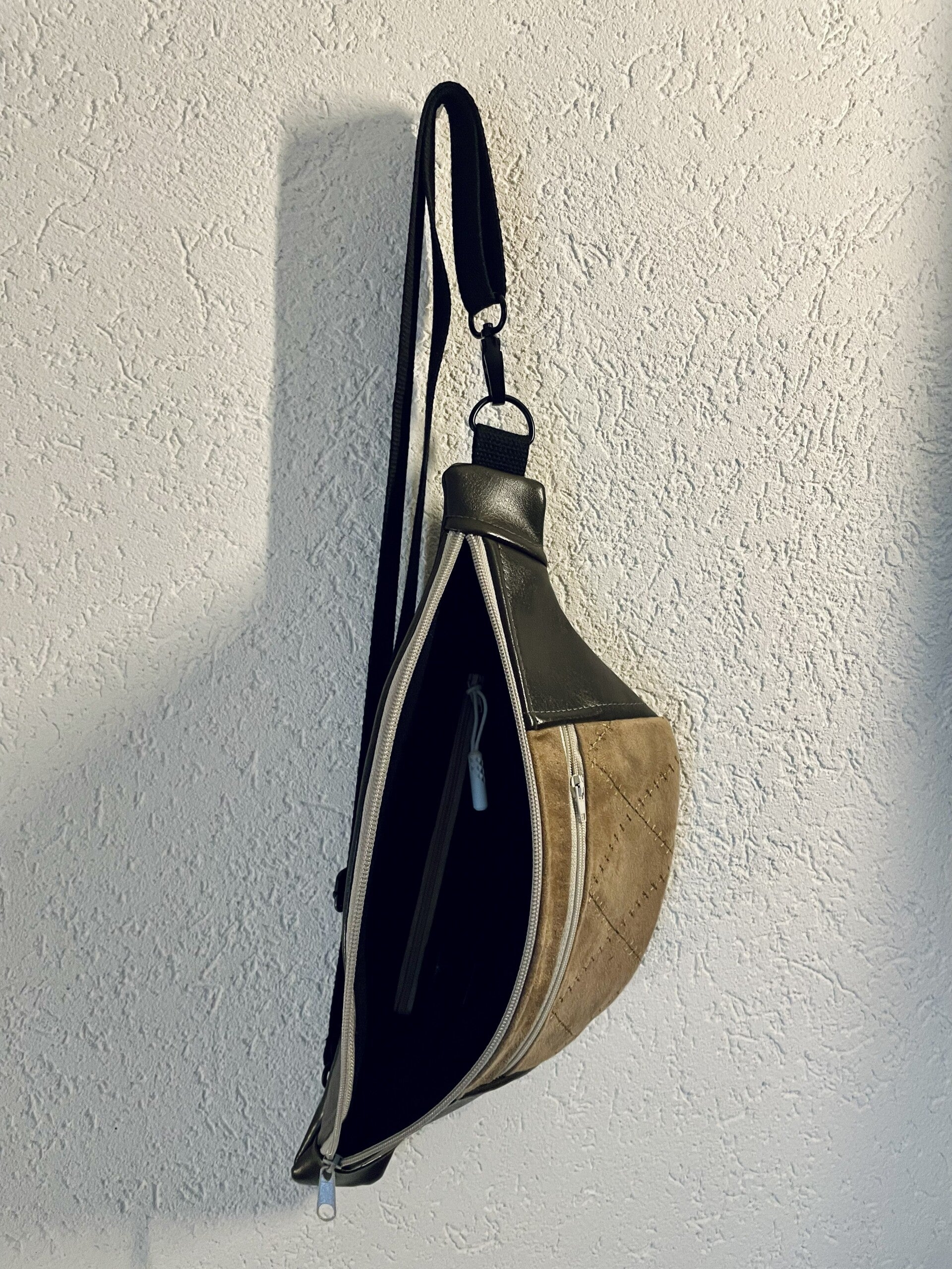 La sangle noire est réglable et permet un porté à la taille ou en bandoulière.